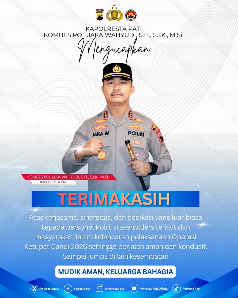 PATI — Keberhasilan pelaksanaan Operasi Ketupat Candi 2026 di wilayah Kabupaten Pati menuai apresiasi dari berbagai pihak. Arus mudik dan balik yang berlangsung aman, tertib, dan lancar menjadi bukti nyata kuatnya sinergi antara Polri, instansi terkait, dan masyarakat dalam menjaga kondusivitas selama momentum Lebaran tahun ini.
