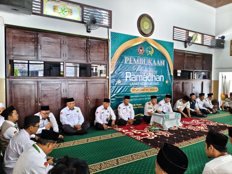 Pati – Lembaga Pemasyarakatan Kelas IIB Pati menggelar kegiatan Pembukaan Pesantren Ramadhan bagi Warga Binaan Pemasyarakatan (WBP) di Masjid At-Taubah Lapas Pati, Senin (23/02). Kegiatan tersebut dihadiri oleh Kalapas, pejabat struktural, Penyuluh Kementerian Agama Kabupaten Pati yang akan dilaksanakan selama dua minggu dari tanggal 23 Februari hingga 6 Maret 2026.