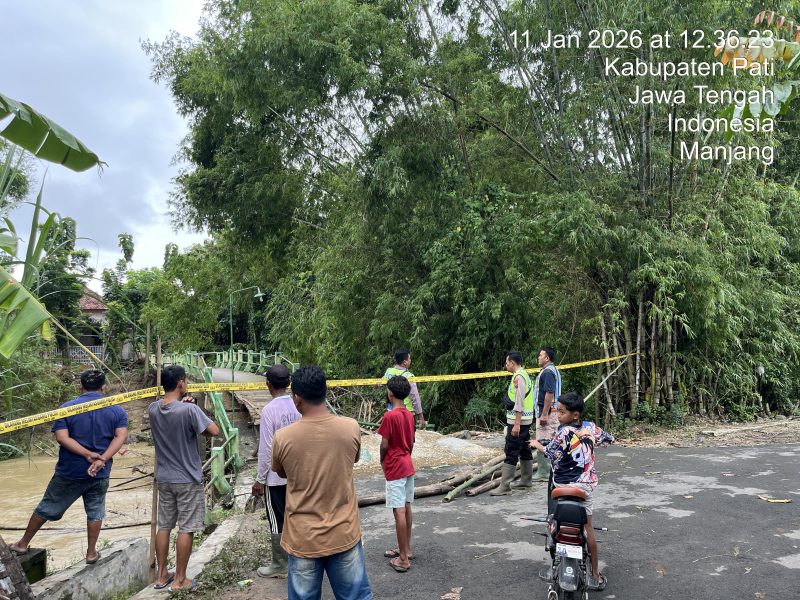 Pati – Jembatan penghubung Desa Manjang, Kecamatan Jaken, Kabupaten Pati dengan Desa Sekarsari, Kecamatan Sumber, dilaporkan amblas pada Minggu (11/1/2026) sekitar pukul 10.00 WIB. Kerusakan terjadi pada talud dinding jembatan Sungai Randugunting dan langsung mendapat penanganan cepat dari jajaran Polsek Jaken.