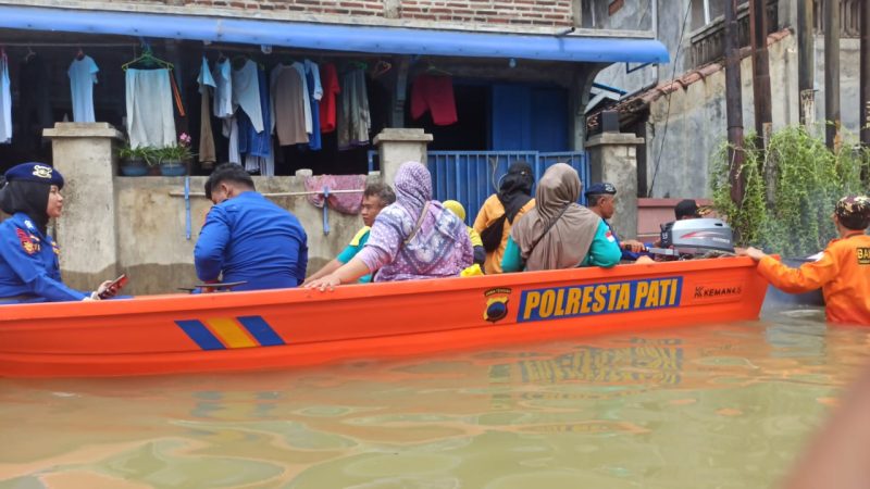 Pati – Satuan Polisi Perairan dan Udara (Sat Polairud) Polresta Pati melaksanakan kegiatan kemanusiaan berupa evakuasi warga serta penyaluran bantuan barang-barang kesehatan di Desa Bumirejo, Kabupaten Pati, Jumat (17/1/2026). Kegiatan ini dilakukan sebagai respons cepat atas dampak banjir yang masih merendam sejumlah wilayah permukiman warga.