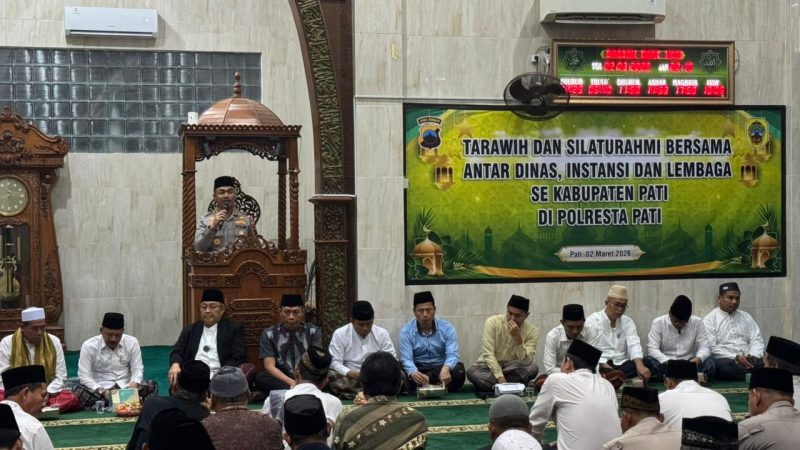 PATI – Suasana khusyuk menyelimuti Masjid Al Ikhlas Polresta Pati, Senin (2/3/2026) malam. Jajaran Forkopimda, tokoh agama, serta ratusan jamaah memadati masjid dalam kegiatan Tarawih dan Silaturahmi Bersama (Tarhima) putaran ke-2 antar dinas, instansi, dan lembaga se-Kabupaten Pati tahun 1447 H/2026 M.